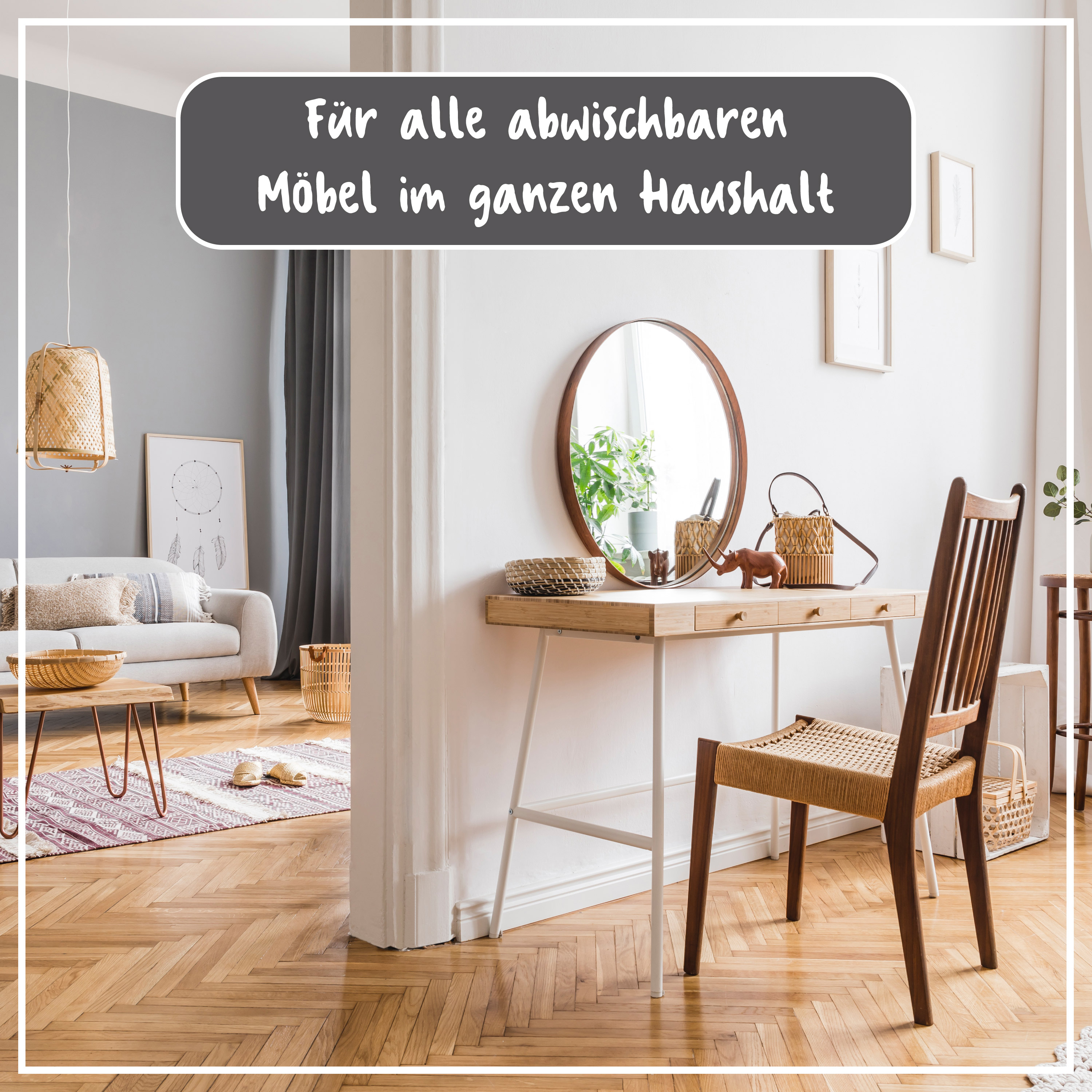 Pflegehinweise auf den Produkten beachten. Eine kleine Menge des Produkts auf das Tuch geben und gleichmäßig auf der Oberfläche verteilen. Bei Holz immer in Maserrichtung wischen.