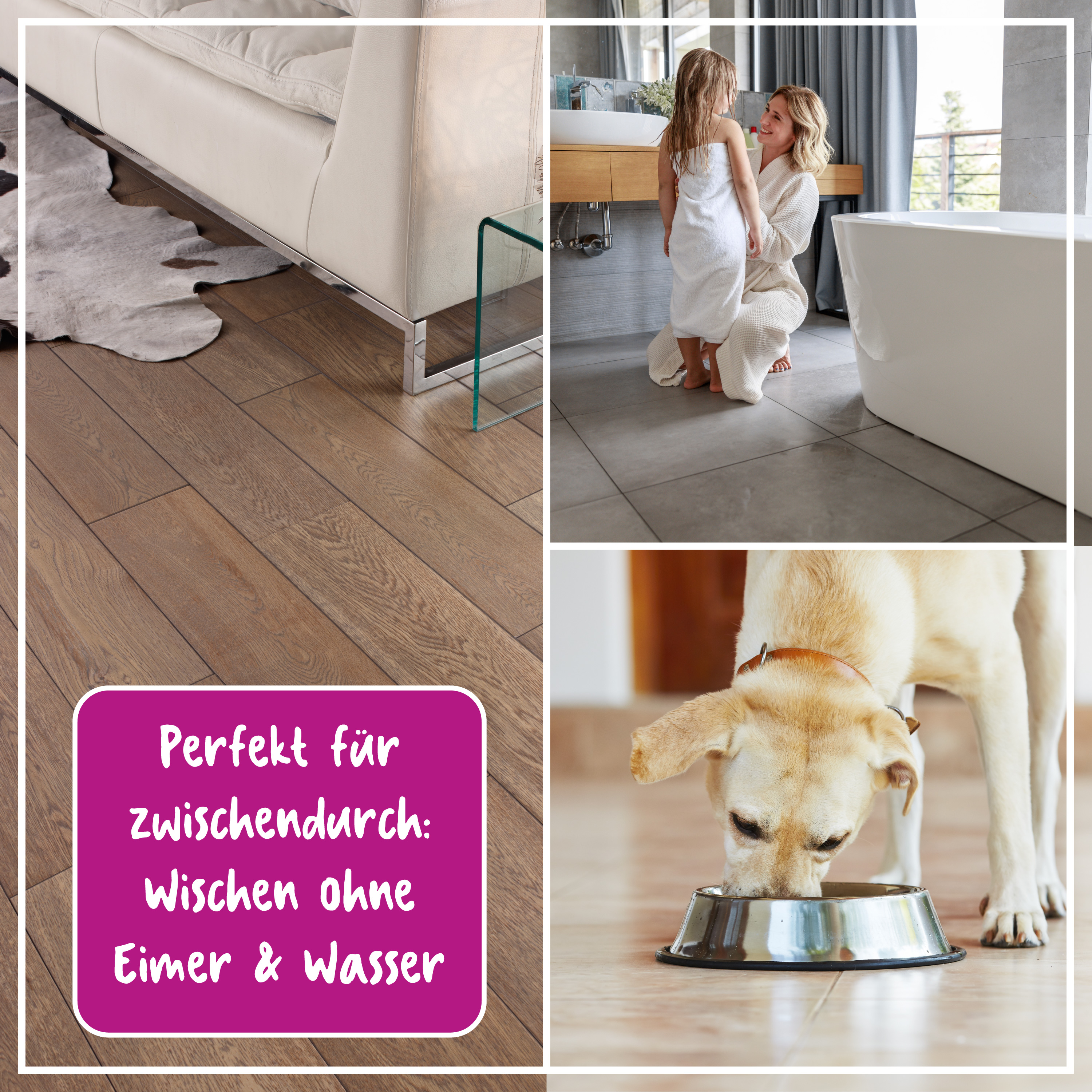 Tuch entnehmen und auf einen geeigneten Wischer aufspannen oder einfach per Hand anwenden. Wie gewohnt wischen, trocknen lassen, fertig! Nach Entnahme wieder fest verschließen. Gebrauchte Tücher einfach in den Hausmüll geben. Groben Schmutz zuvor absaugen oder auffegen.