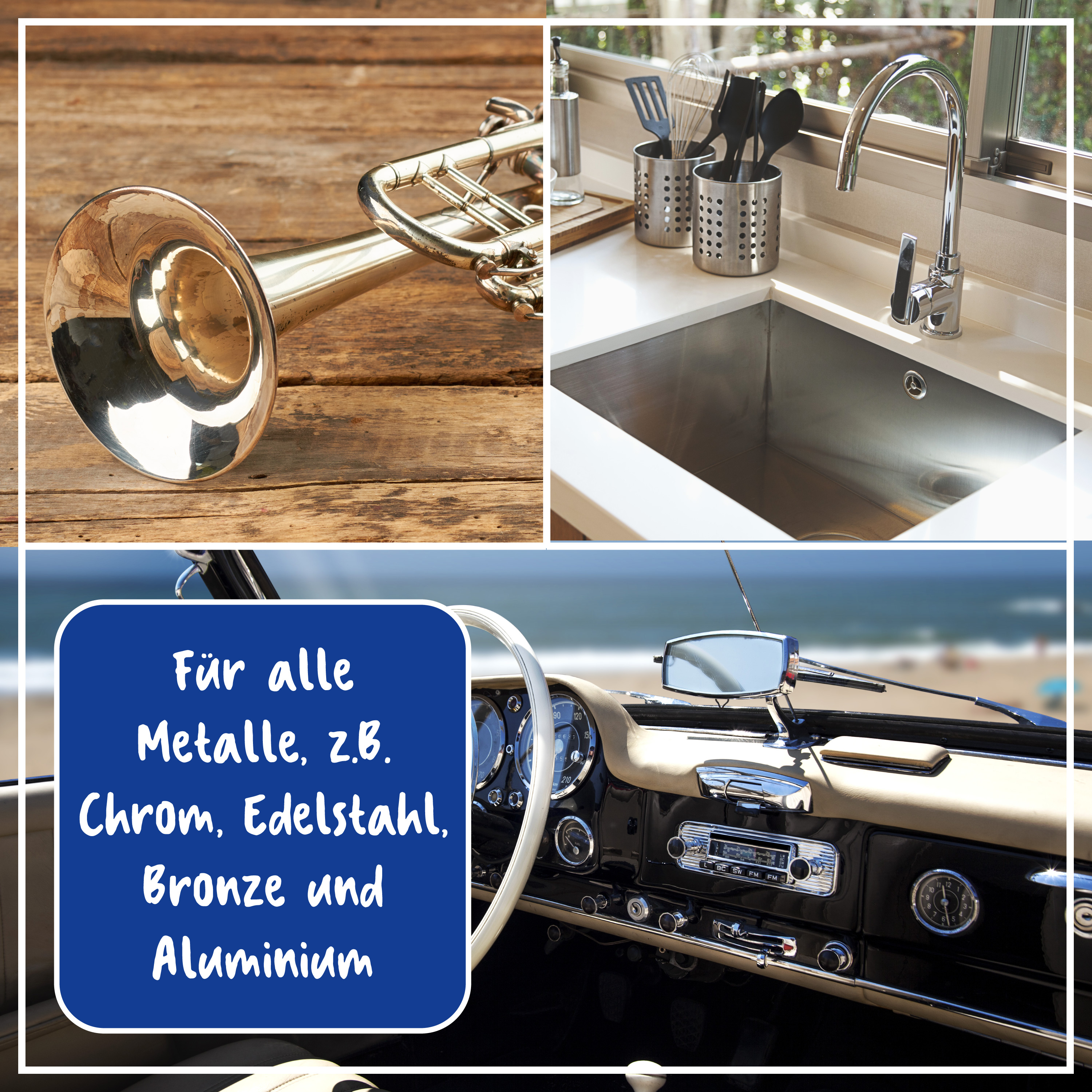 Vor Gebrauch schütteln! Gleichmäßig auftragen und verreiben. Danach abspülen bzw. abwischen. Mit weichem Tuch nachpolieren. Bei starker Verschmutzung die Anwendung wiederholen. Geruchsintensiv, enthält Salmiakgeist.