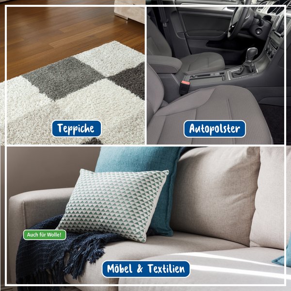 Für Polster und Teppiche aus Kunst- und Naturfasern. Auch für Wolle, Leinen und Seide geeignet