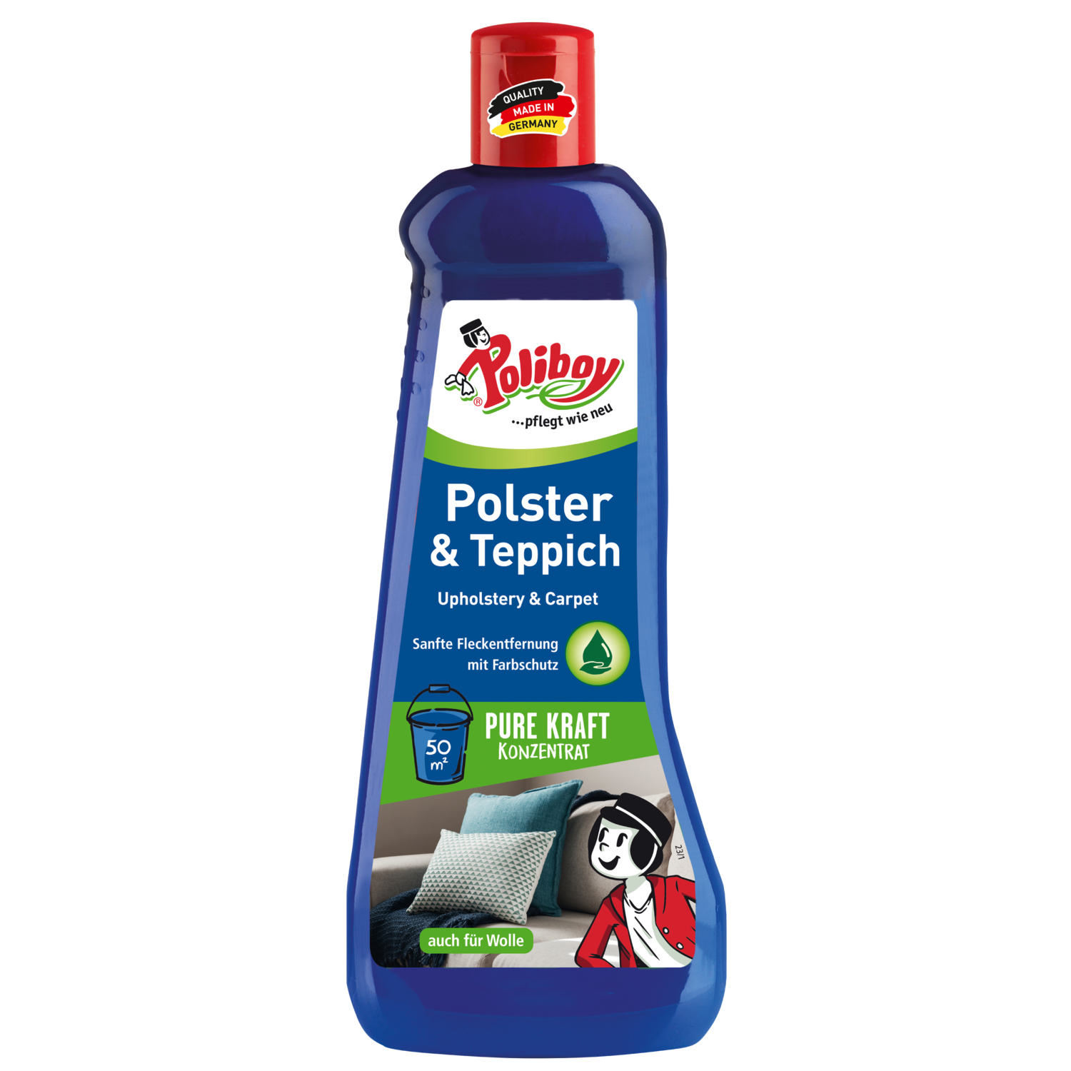 Flecken möglichst schnell behandeln. Vorher an unauffälliger Stelle auf Materialverträglichkeit testen. Fläche absaugen, abbürsten oder ausklopfen. POLIBOY mit Wasser verdünnen (ca. 1:5), mit Schwamm Schaum erzeugen, auftragen und einmassieren. 2-4 Stunden trocknen lassen und dann absaugen. Für die Fleckentfernung einen Spritzer auf einen feuchten Schwamm geben, gründlich abreiben und mit trockenem Tuch nachreiben.