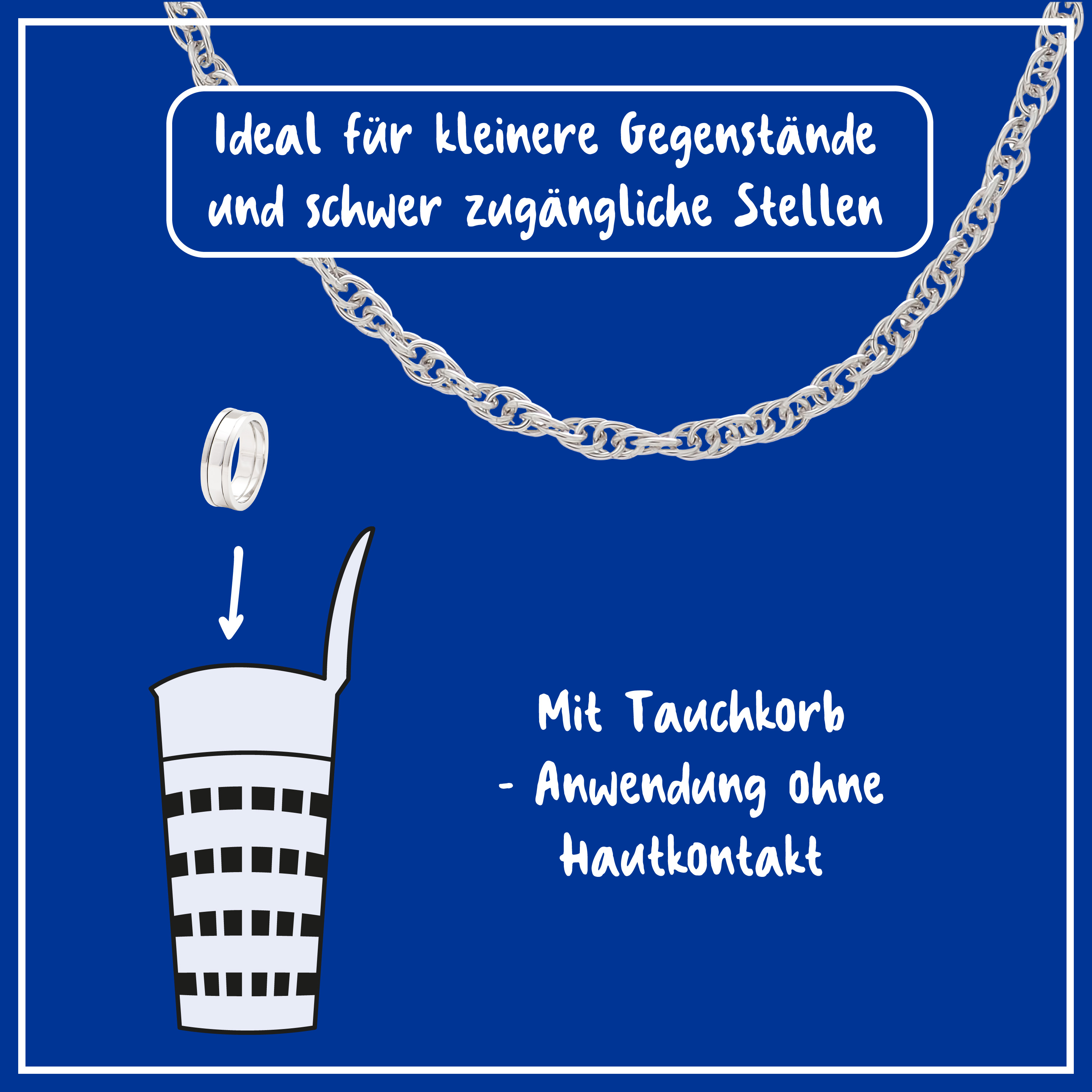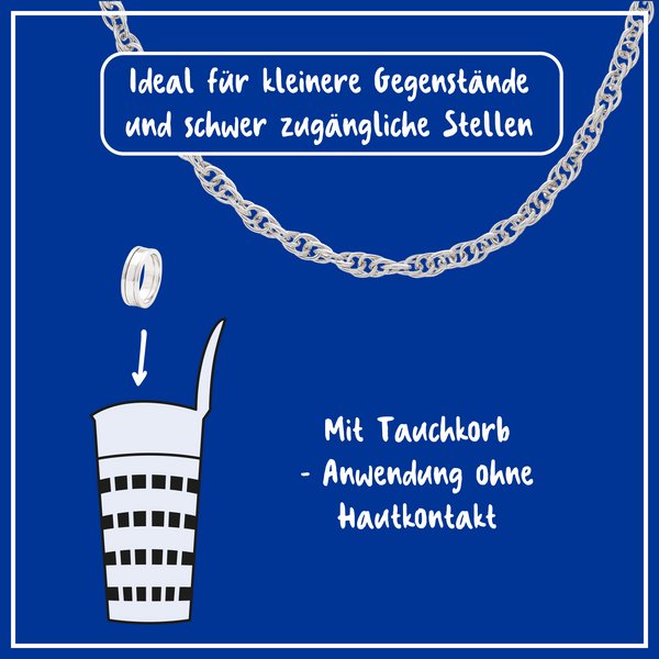 Ketten vor Behandlung mit mildem Spülmittel reinigen oder in ein Ultraschallbad legen. Unterschiedliche Schmuckstücke sowie Gold und Silber einzeln in den Tauchkorb geben und ca. 5 Minuten eintauchen. Anschließend gründlich unter fließendem Wasser abspülen und mit einem weichen Tuch gut abtrocknen. Das Tauchbad ist mehrfach verwendbar, bis die Wirkung nachlässt. Dose stehend lagern.