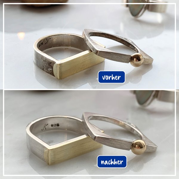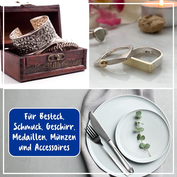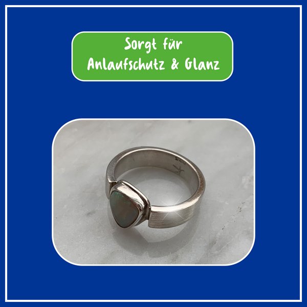 Für eine schonende Pflege empfehlen wir die Verwendung von weichen Baumwolltüchern, unseren Quellschwämmen und unserem Silber Pflegetuch, das nicht nur neuen Glanz zaubert, sondern auch schonend Anlaufstellen entfernt.